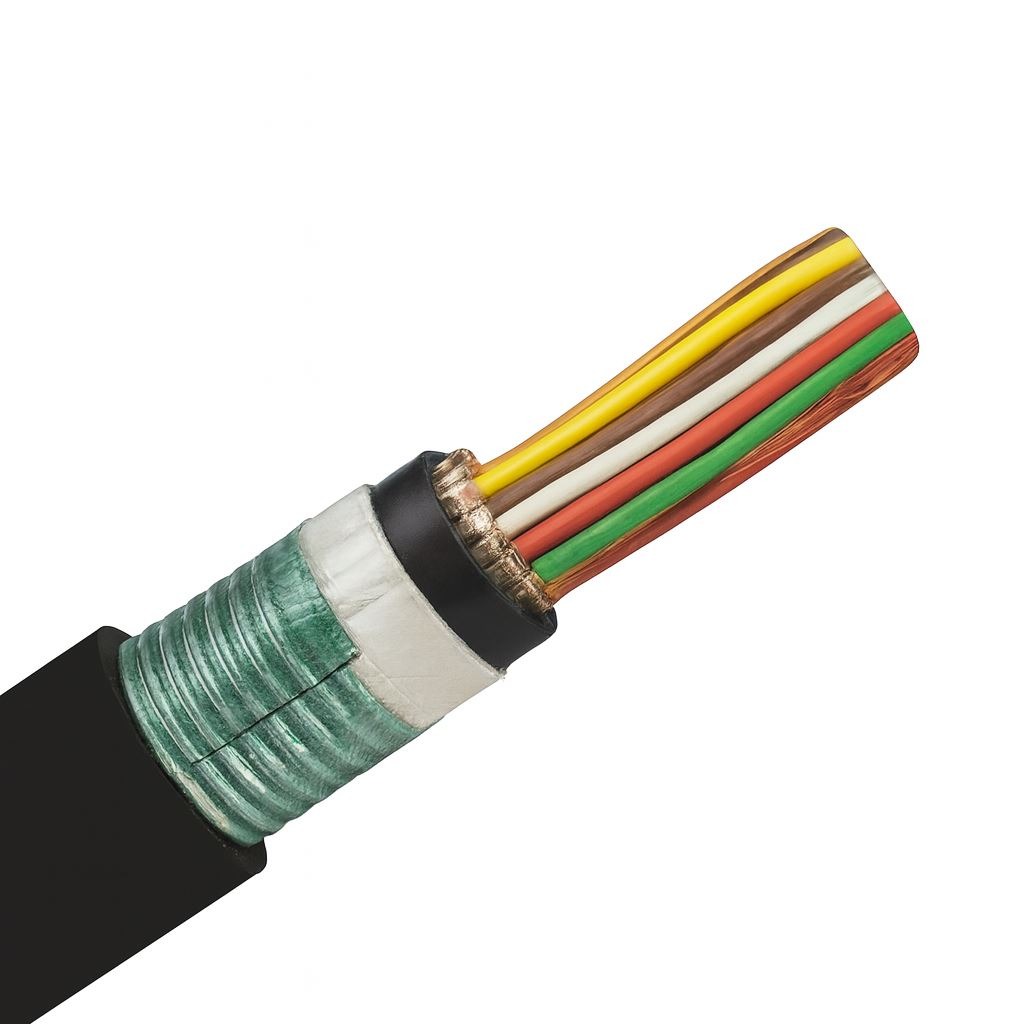 Second shield: 0.25 mm co-polyester coated corrugated steel tape provides structural strength and EMI protection.
